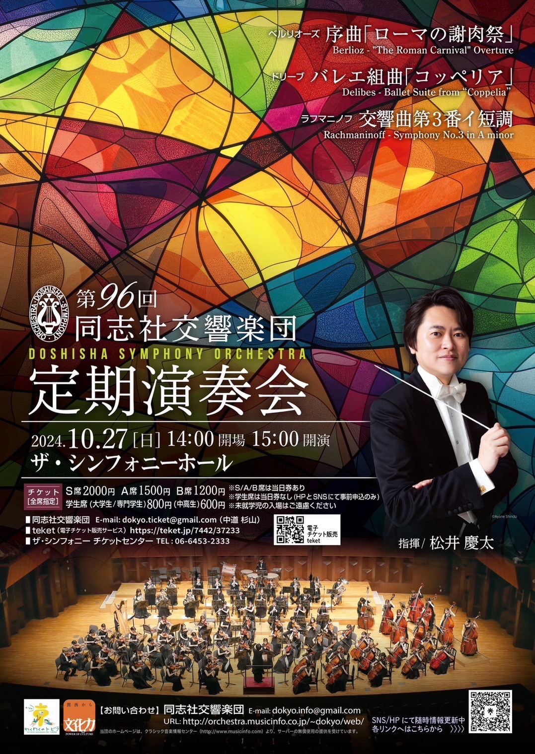 開催日程 : 2024年10月27日 開催時間 : 15:00 〜 17:00 [開場時間等] 14:00開場 開催場所 : ザ・シンフォニーホール 14,898m 料金 : S席 2,000円、A席 1,500円、B席 1,200円、大学生・専門学生席 800円、中学生・高校生席 600円(S/A/B席は当日券有、前売券と当日券の値段は同一)(学生席・中高生席は前売券のみ)